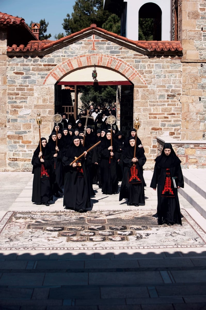 The central yard, enclosed by the buildings exclusively serving the life of the sisterhood, observes Mt. Athos traditions. At the centre stands the Katholikon, founded on 14 September 1980 by the late Metropolitan of Kassandreia, Synesios.
